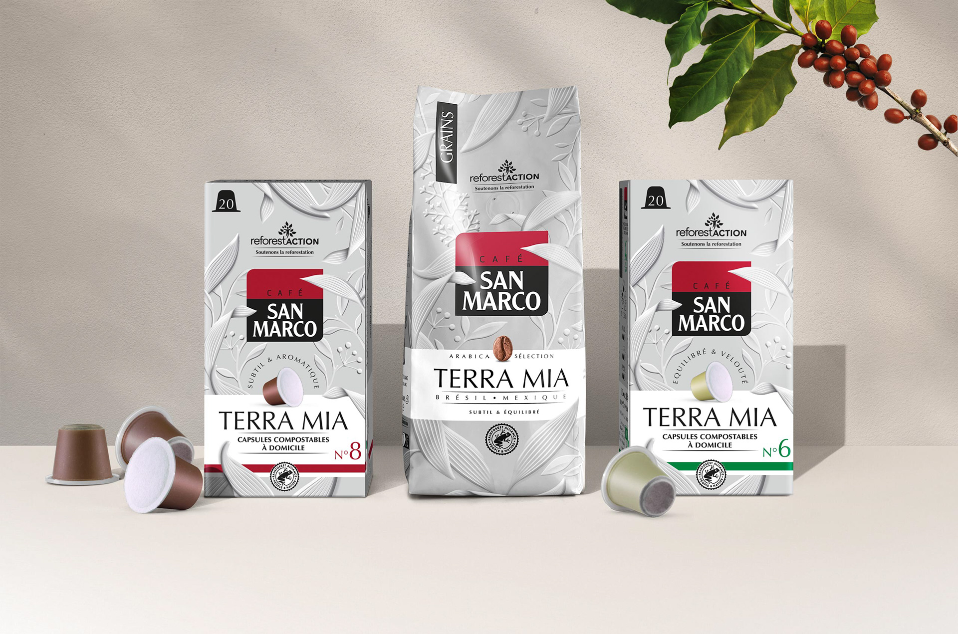Conception design packaging et charte graphique pour Terra Mia, nouvelle gamme des cafés San Marco. Terra Mia est le projet de développement durable promu par San Marco. Soucieux d'agir pour l'environnement, cette gamme de café s'engage auprès de Rainforest Alliance et Reforest'Action pour participer à la restauration des écosystèmes et de la biodiversité des exploitations agricoles.